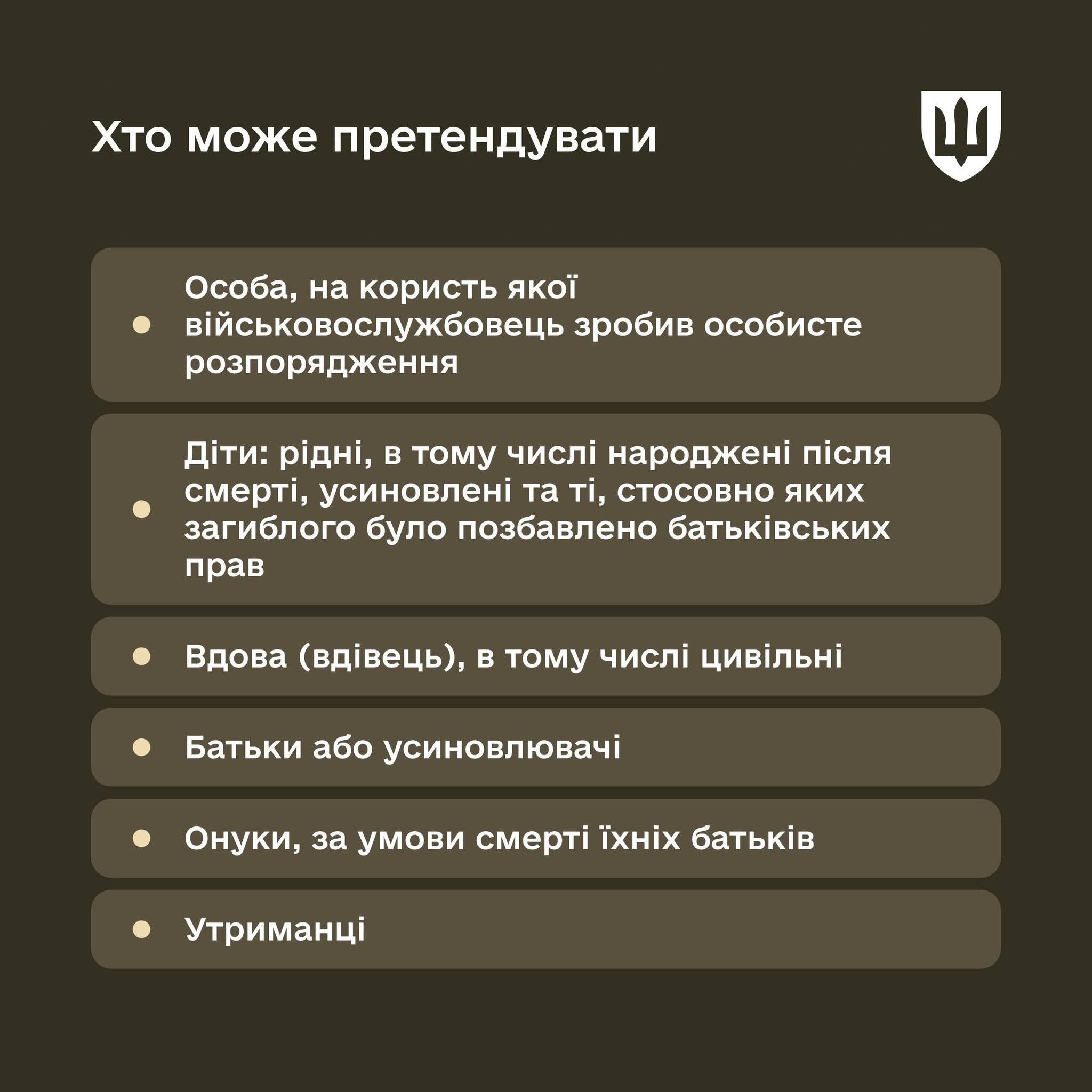 У разі відсутності такого документа кошти розподіляються між дітьми, вдовою/вдівцем, батьками, внуками (за певних умов), утриманцями або особами, з якими загиблий проживав у незареєстрованому шлюбі (якщо це підтверджено судом).