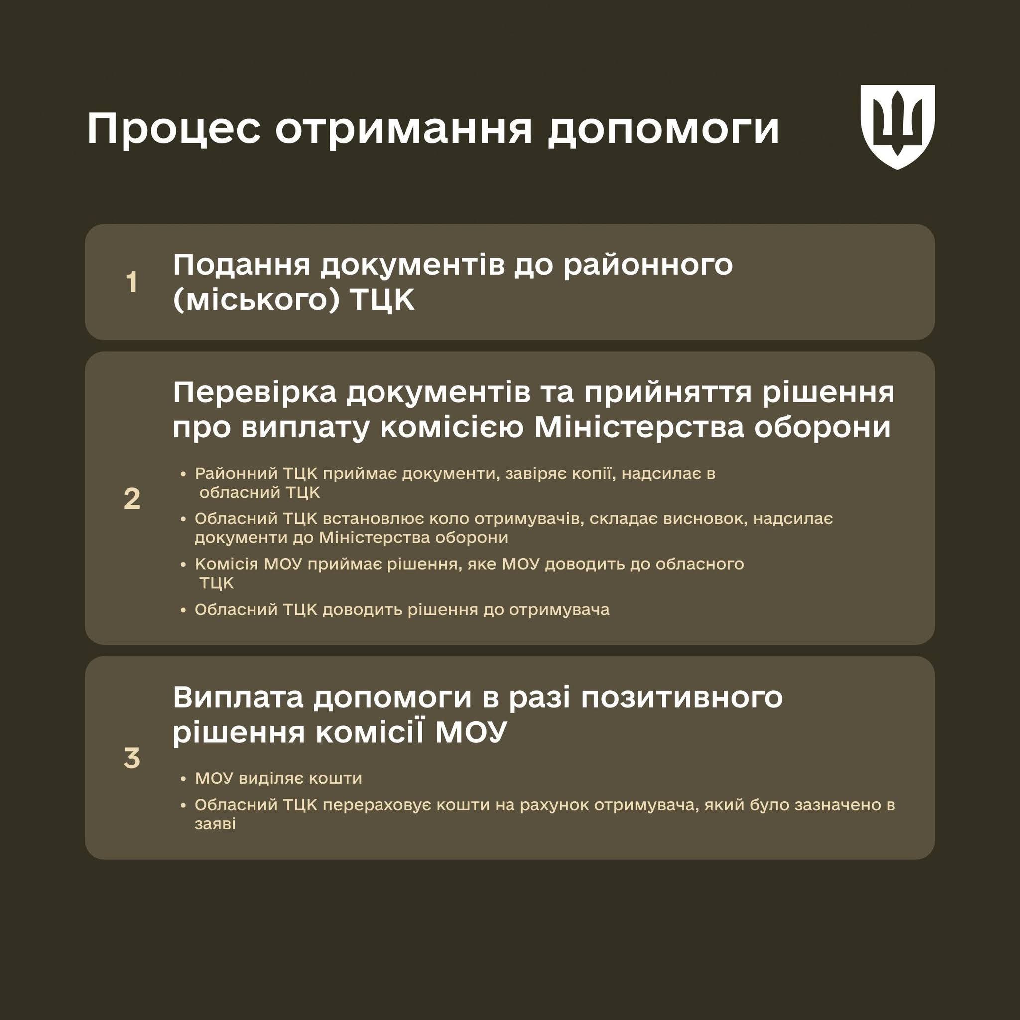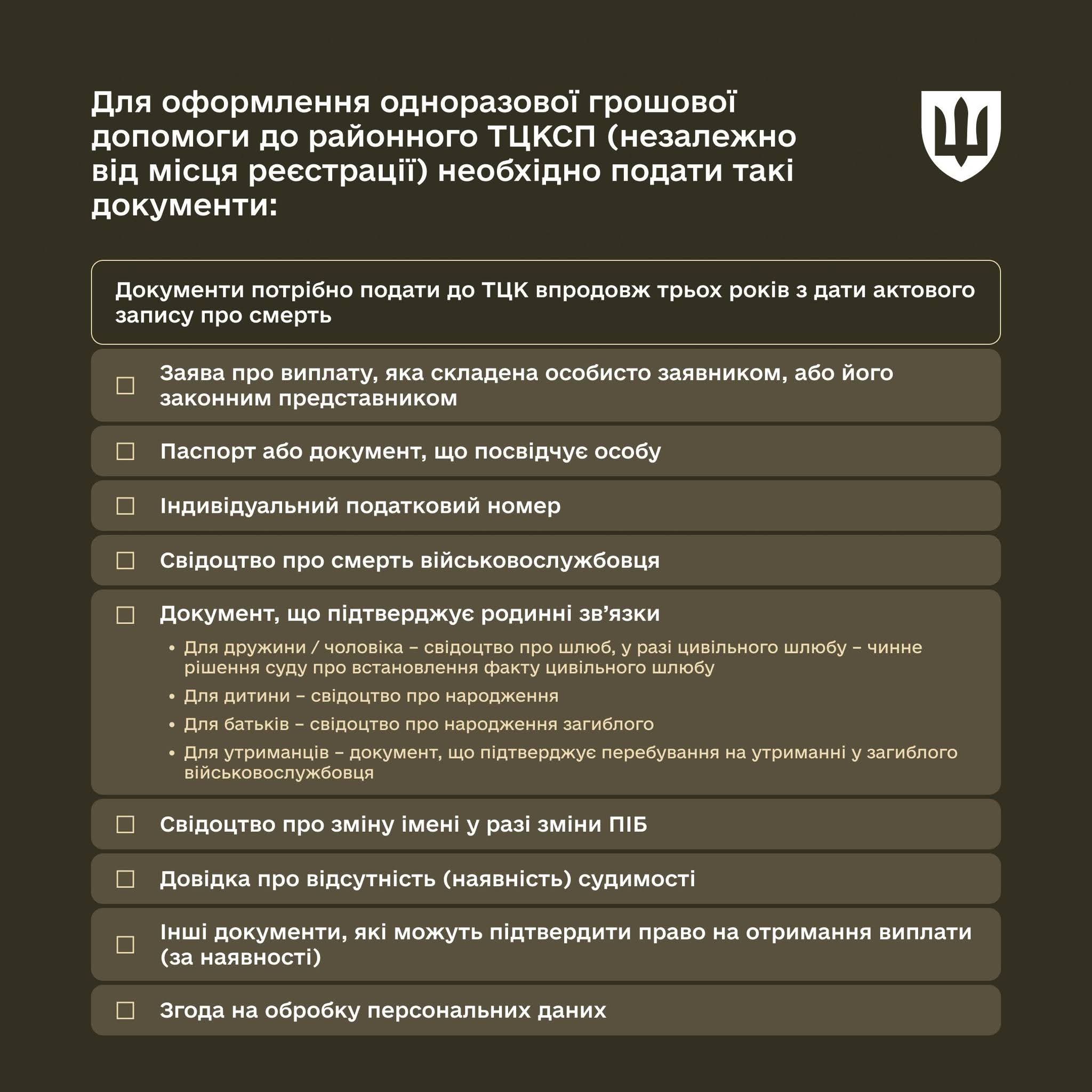 Звернутися за допомогою можна протягом трьох років із дати складання запису про смерть, до відповідного ТЦК та СП або відомства, де служив військовий.