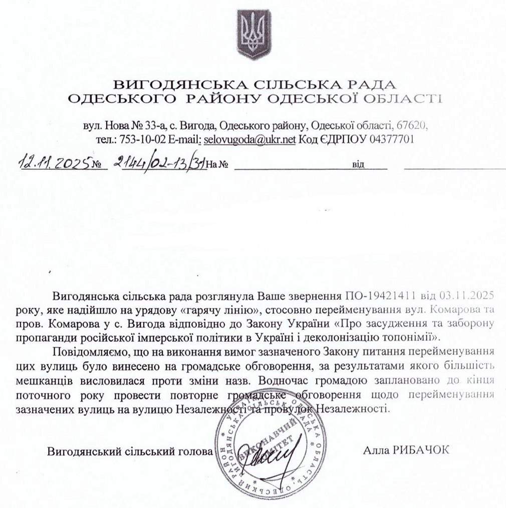 Вигодянська сільська рада повідомила, що звернення ГО «Деколонізація. Україна» щодо перейменування надійшло на урядову «гарячу лінію».