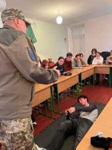 Учням показали, як оцінювати стан постраждалого. Також розповіли про види кровотеч та способи їх зупинки. Окремо відпрацювали накладання турнікетів та використання підручних засобів.