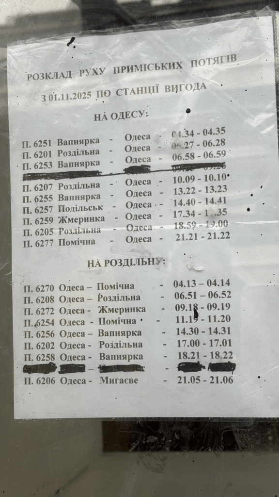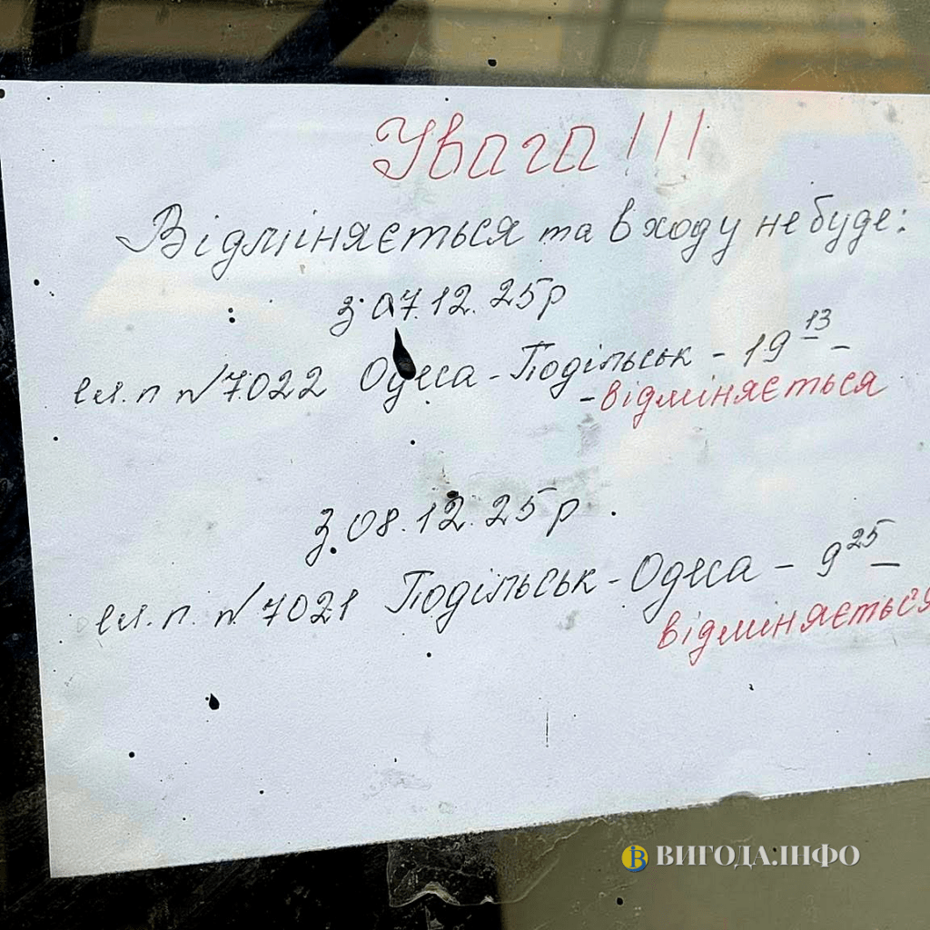Вже відсьогодні, 8 грудня, скасування торкнулося і зворотного рейсу № 7021 Подільськ – Одеса (Слобідка – Одеса-Головна). За звичним графіком він мав би прибувати на станцію Вигода о 09:25 ранку.