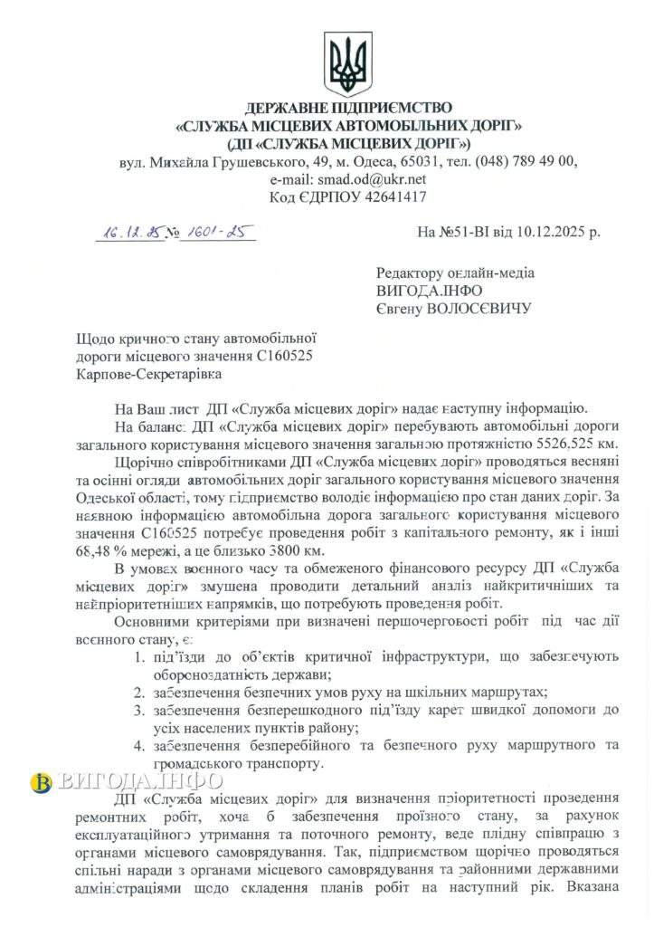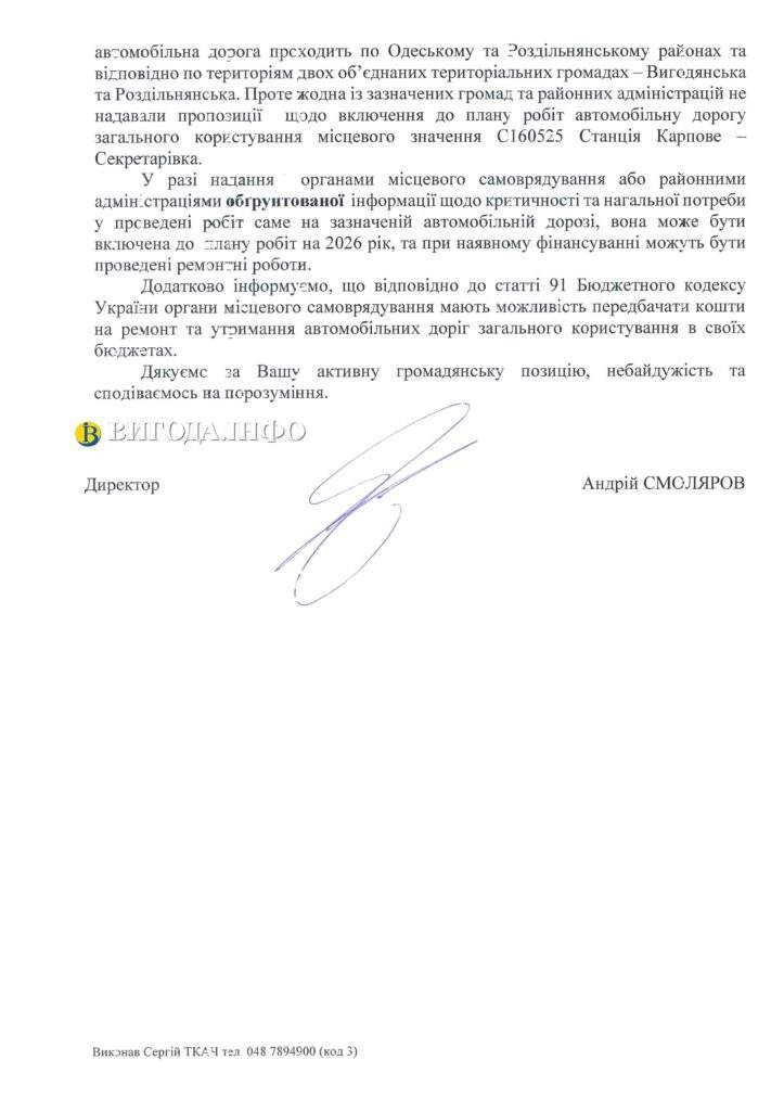«Автомобільна дорога проходить по Одеському та Роздільнянському районах та відповідно по територіях двох об’єднаних територіальних громад — Вигодянська та Роздільнянська. Проте жодна із зазначених громад та районних адміністрацій не надавали пропозиції щодо включення до плану робіт автомобільну дорогу загального користування місцевого значення С160525 Станція Карпове – Секретарівка», — йдеться у відповіді директора ДП «СМАД» Андрія Смолярова.