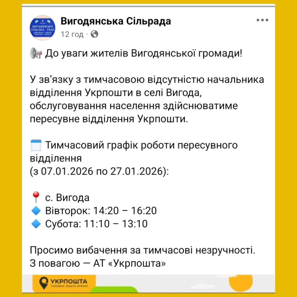 З 7 по 27 січня 2026 року пересувне відділення Укрпошти працюватиме у Вигоді за графіком. У вівторок – з 14:20 до 16:20, у суботу – з 11:10 до 13:10.